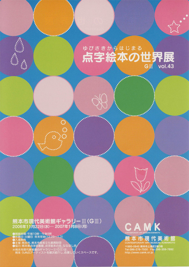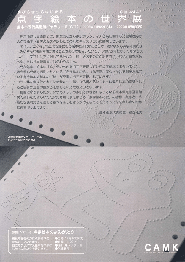 06.11.22-07.01.08 GV vol.43 ゆびさきからはじまる 点字絵本の世界展 詳細情報1(jpg形式 163 kb) 詳細情報2(gif形式 278 kb)