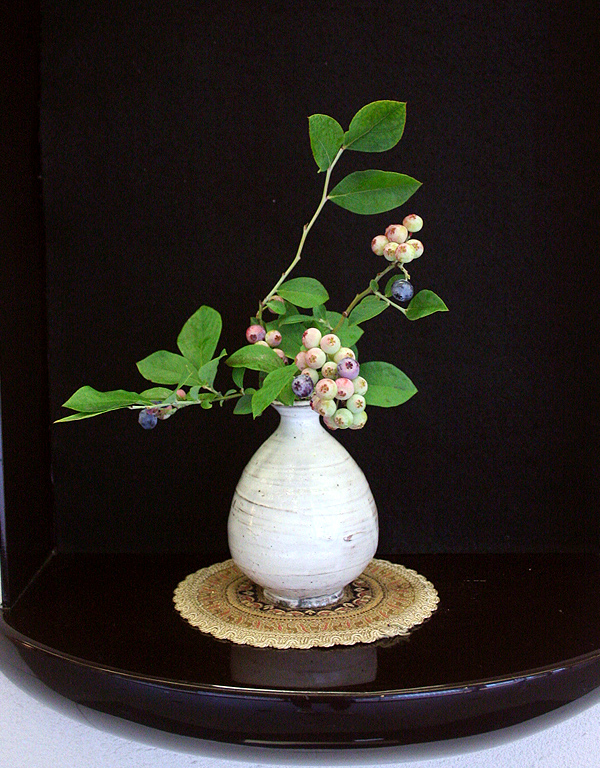 ブルーベリーは春に白い花がさき、夏にかわいい甘すっぱい実をつける。秋に紅葉してすてきな花材です。
