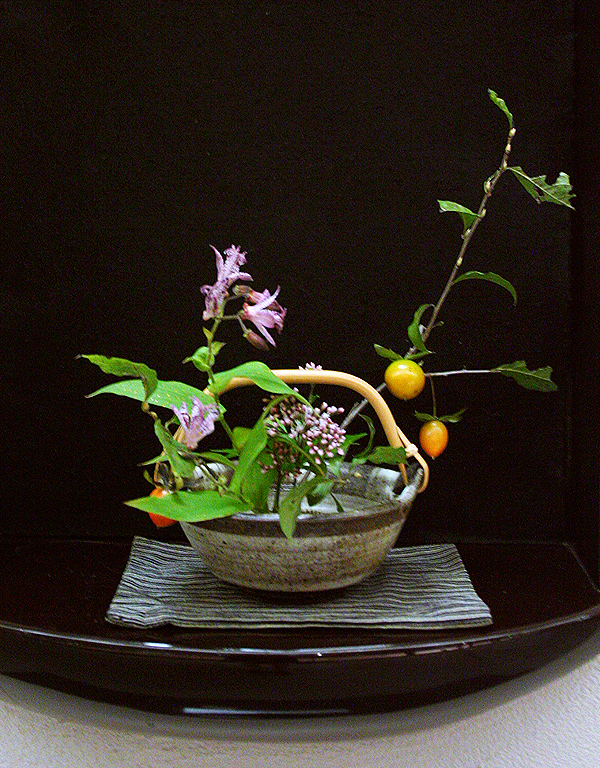 庭のロウヤ柿が色付いていました。ホトトギスと合わせてみました。