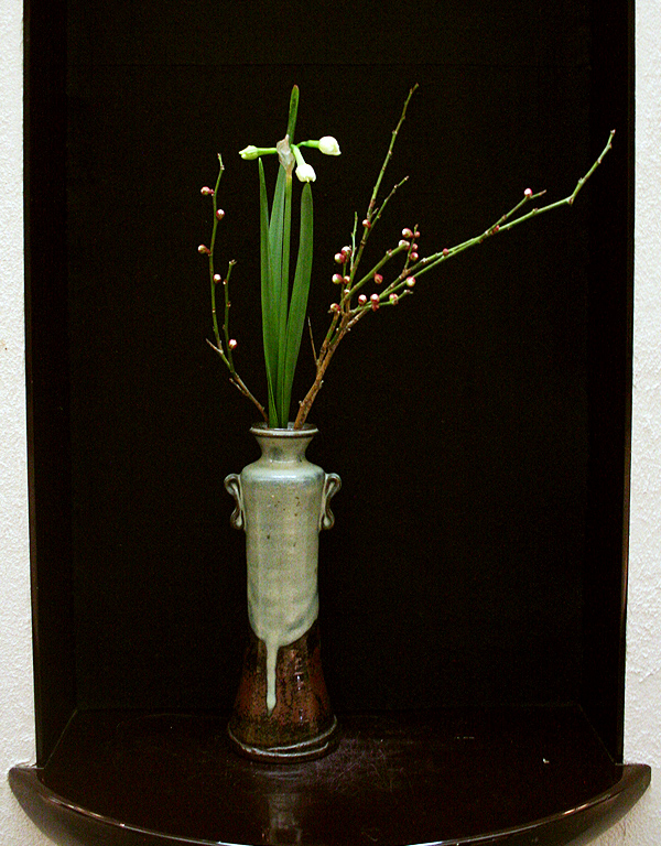厳しい冬に含みかけた梅の蕾が可愛らしく水仙を活けてみました