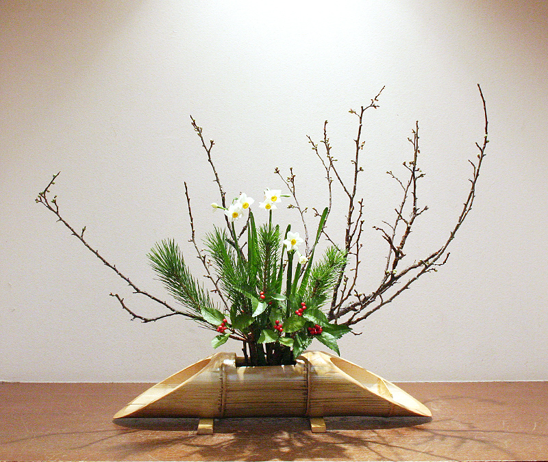新年を祝し、松竹梅をいけました。※竹は花器に使いました。