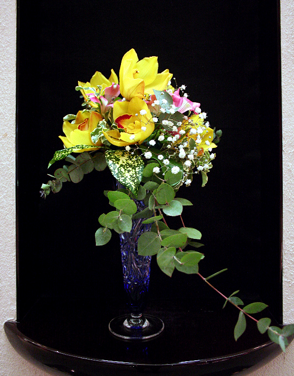 季節の先取りでクリスタルの花器を使って花いっぱいのアレンジメントを生けてみました。
