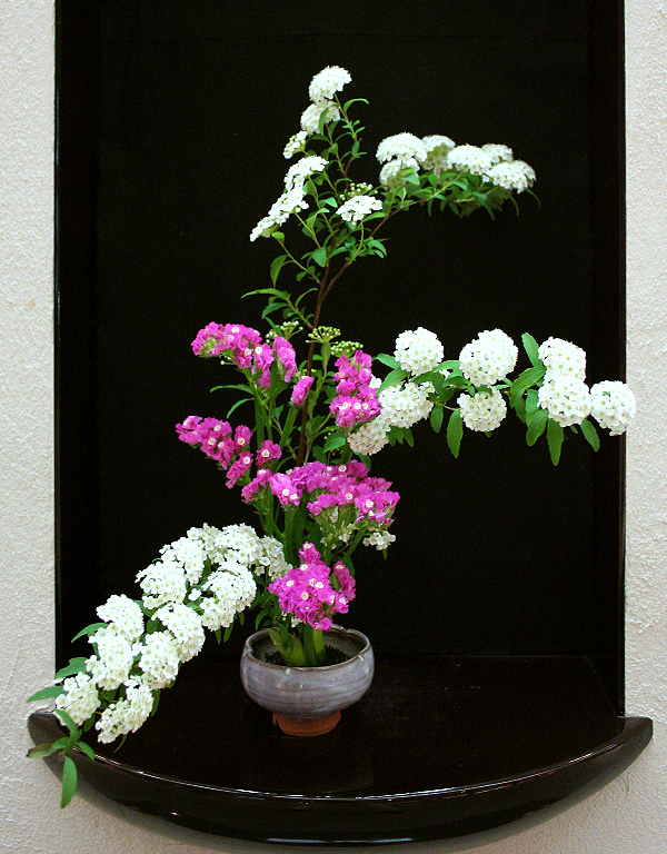 こてまりの白とスターチスの濃いピンクで初夏を感じるような気持で活けました。