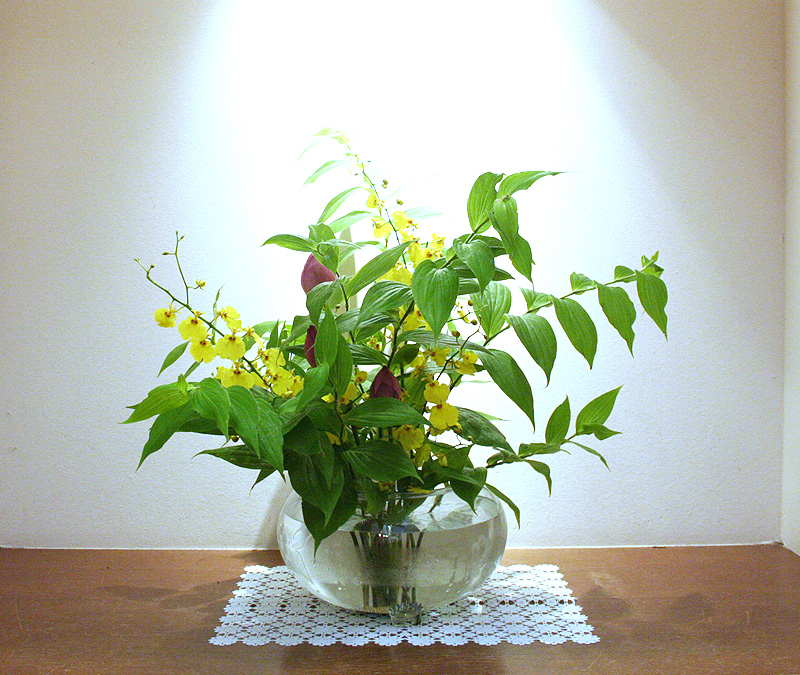 ホトトギスの葉の緑を涼しげに夏らしく生けてみました。