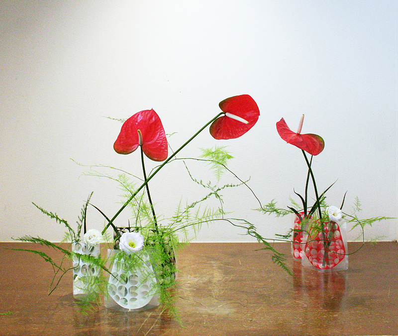 暑い夏をすずしげに水を見せて生けました。アスパラがさわやかさをプラスしているかなと思います。