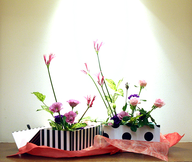 雑貨店で購入した箱に生けてみました。白黒模様の箱にやさしい色の花を取り合せました。