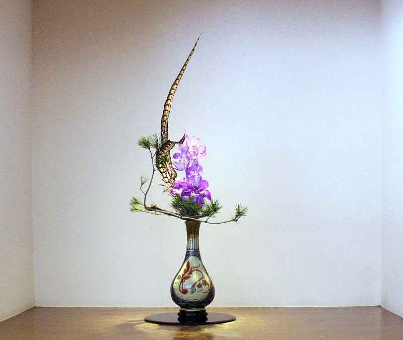 壺屋焼の器に格調髙く山鳥の羽をそえてみました。