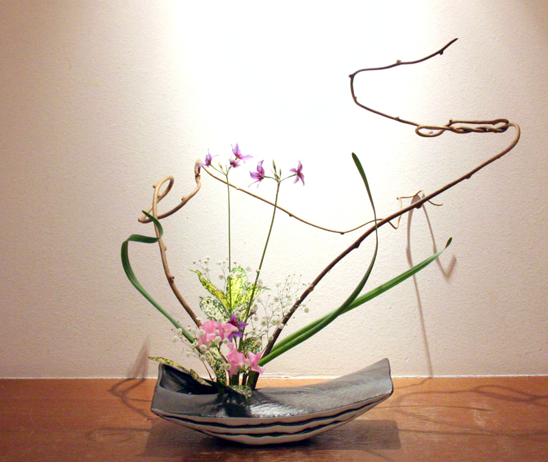 キューイヅルの動きに合わせて水仙の葉を入れ、可愛らしく生けました。