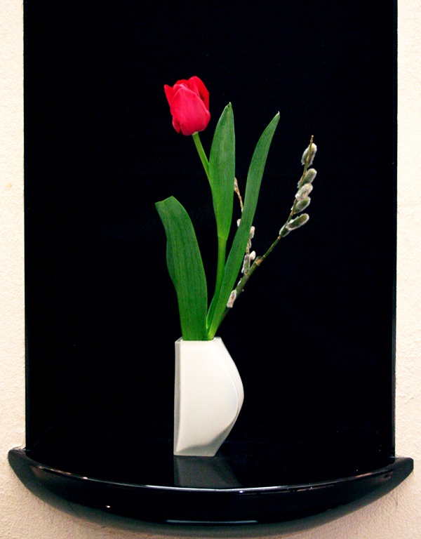 真っ赤なチューリップに春を感じて頂きたく活けました。可愛いねこ柳をアクセントに。