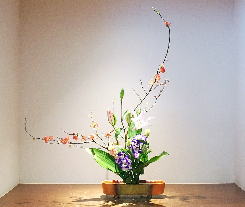 ボケの枝の美しい曲線を生かして足元をトルコキキョウであしらいました。