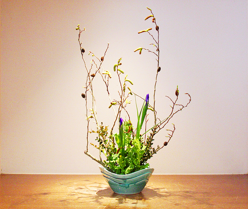 黒灰色のハンノ木に初春らしい菜の花を添えて、明るい器に活けました。