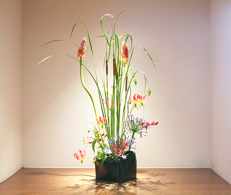 緑の線の美しさの中に力強さを示す赤のグロリオサを使い、モダンさを表現しました