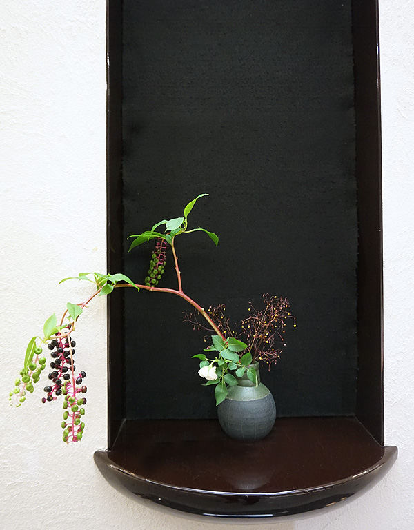 山ごぼうの実の色にミニバラを合わせて可憐なイメージをしました。