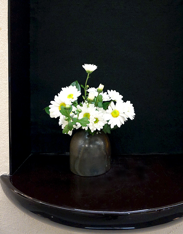 庭の白小菊を椿の葉と一緒に活けてみました。