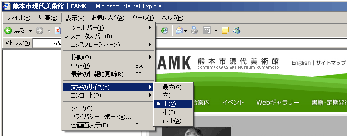ほとんどのブラウザはウィンドウ上部にあるメニューバーの「表示」メニューから、「文字のサイズ」や「文字の拡大・縮小」「大きく」「小さく」などの項目がありますので各ブラウザのヘルプなどをよく読み、見やすい大きさになるよう調整しすることを推奨します。 |